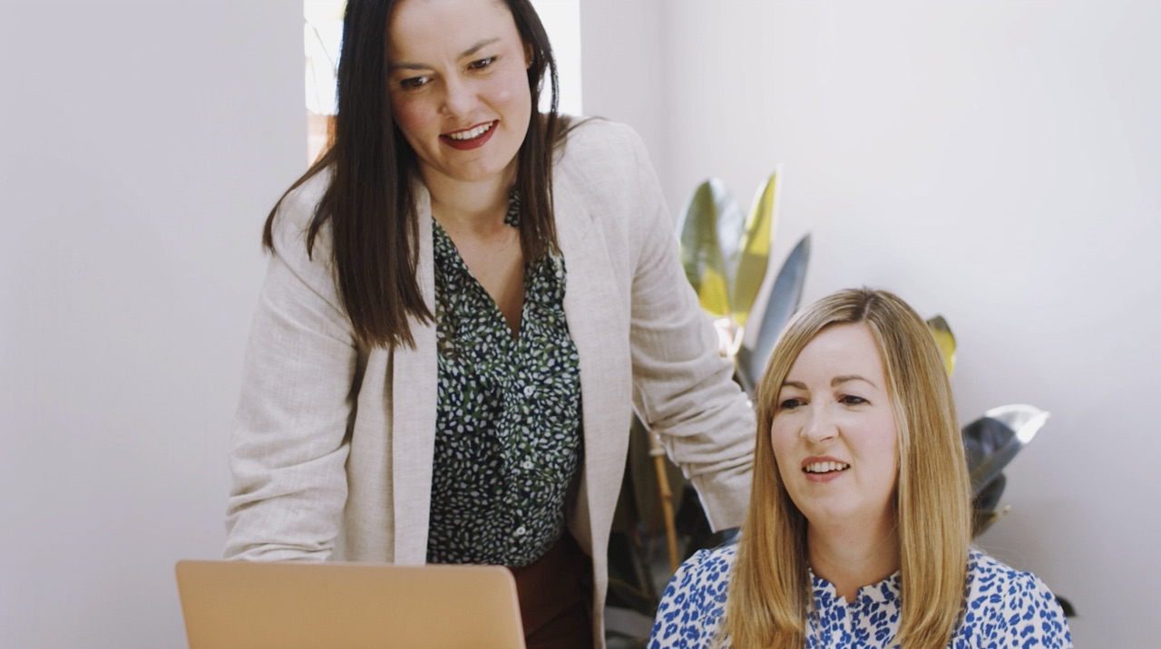HR Director Sian Whelan and Recruitment Director Siobhan Collyer sat on a blue sofa both wearing business wear. Siobhan is looking at an Apple Macbook whilst Sian has a notebook.